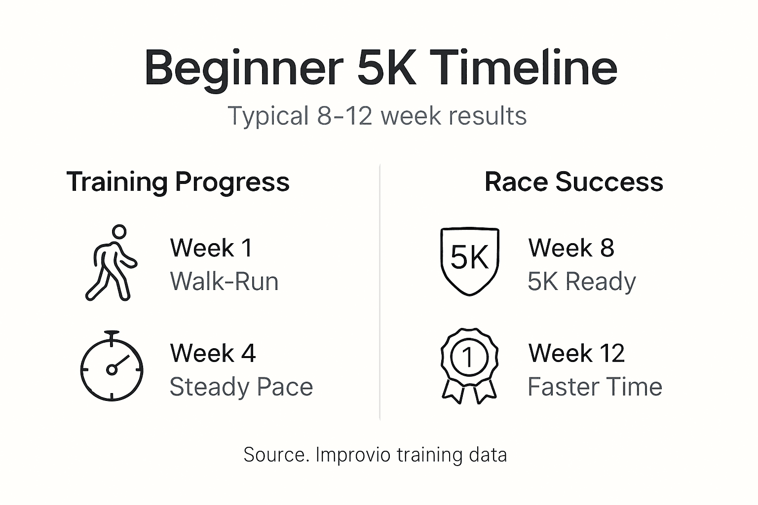 Your progress varies based on age, prior activity level, and consistency. A previously sedentary 50 year old naturally progresses differently than an active 25 year old. Both can successfully complete a 5K by following appropriate training principles.
