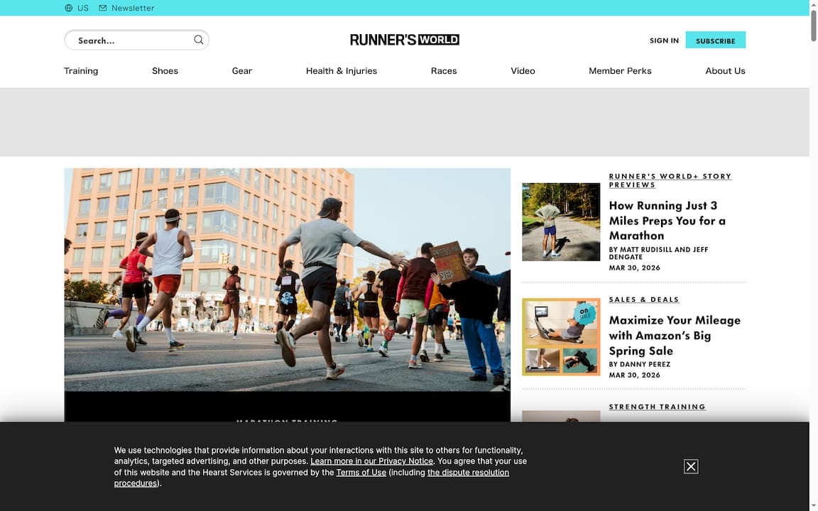 A beginner training for their first marathon can use Runner's World to pick a training plan template, read shoe reviews for the right fit, and follow nutrition and recovery articles to structure weekly preparation. The site supplements practical needs with event updates.