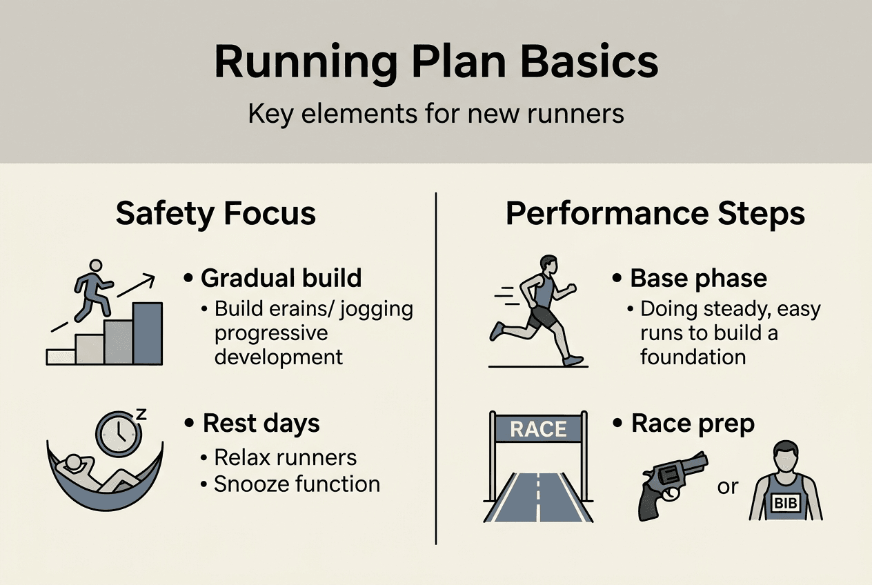 A running plan is a structured schedule that gradually builds your fitness and prepares you for races safely over weeks or months. It prevents injury by controlling how quickly you increase mileage and intensity. Plans also keep you motivated by providing clear daily workouts and measurable progress toward your goal. Without structure, most new runners either do too much too soon and get injured or lose motivation and quit.