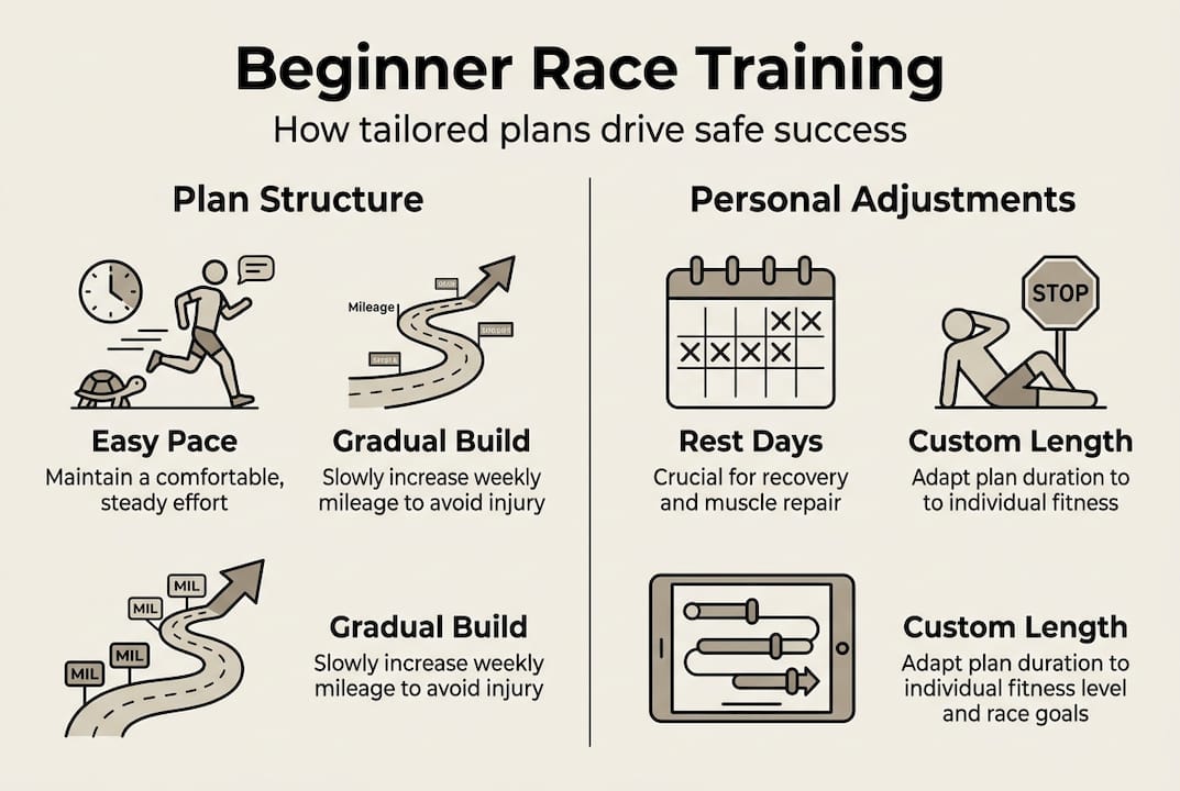 | Periodization approach | Build, peak, and taper phases sequence stress and recovery to protect beginners from burnout and injury. |
